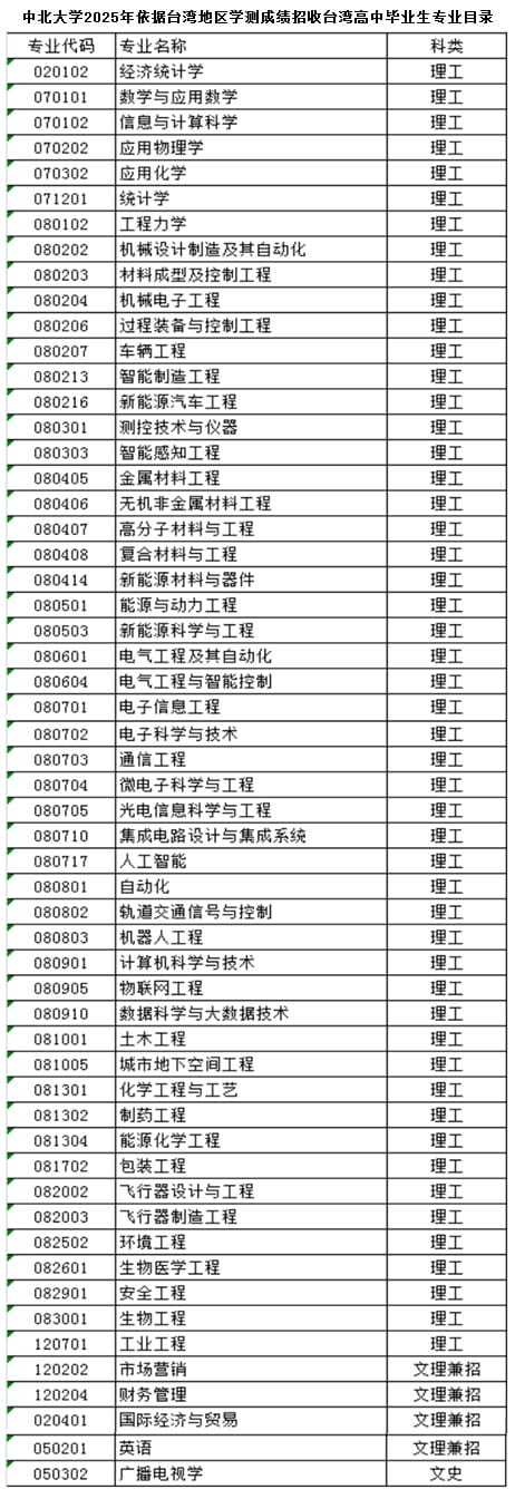 按照《教育部办公厅关于2025年普通高等学校依据台湾地区大学入学考试学科能力测试成绩招收台湾高中毕业生的通知》(教港澳台厅函〔2024〕23号)要求,为做好中北大学2025年招收台湾地区高中毕业生的工作,特制定本招生简章。