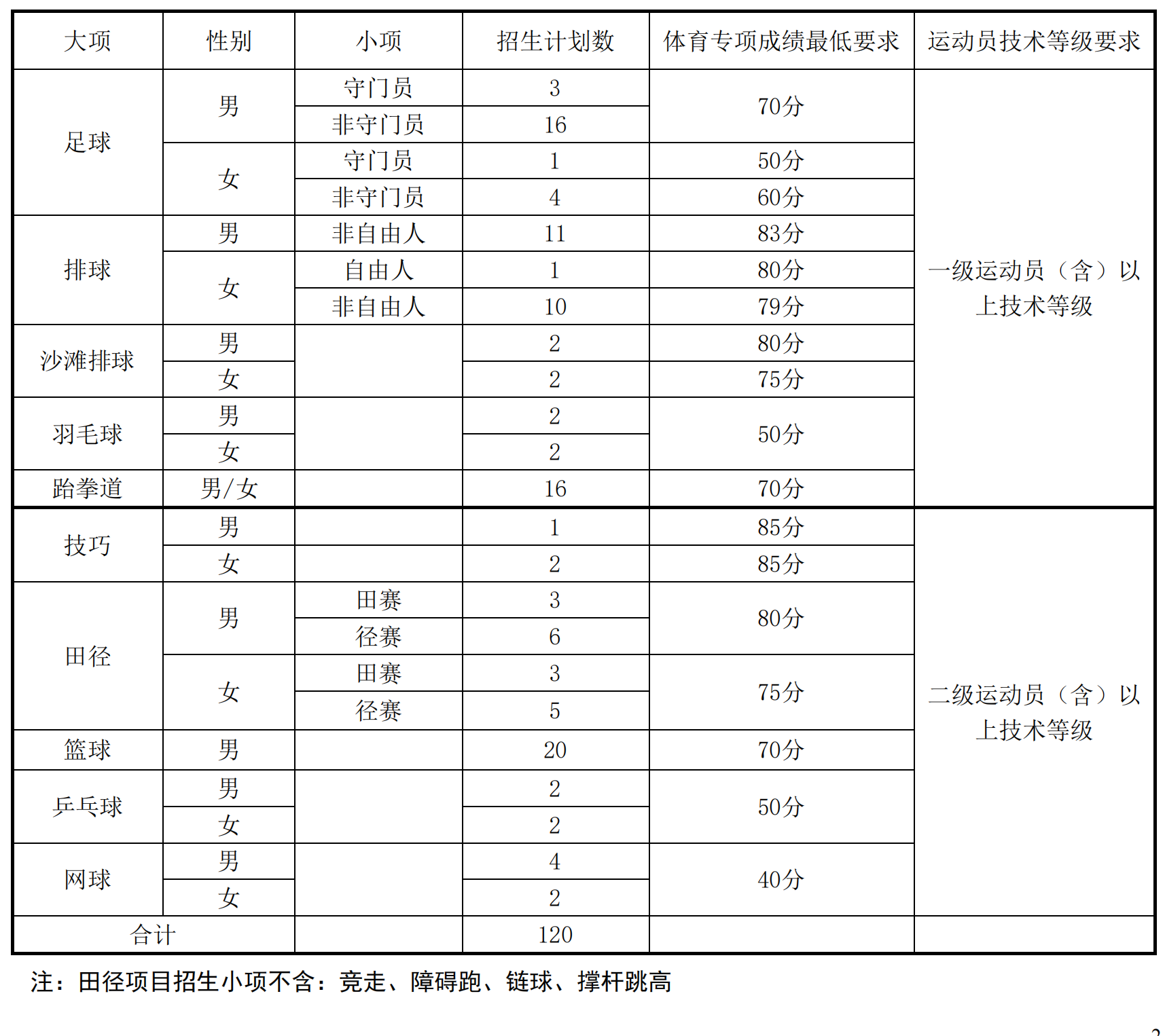 2.具备国家一级运动员(含)以上技术等级称号可报考足球、排球、沙滩排球、羽毛球、跆拳道项目,具备国家二级运动员(含)以上技术等级称号可报考技巧、田径、男子篮球、乒乓球、网球项目。运动员等级证书审批日期为2016年1月1日至2026年3月10日;